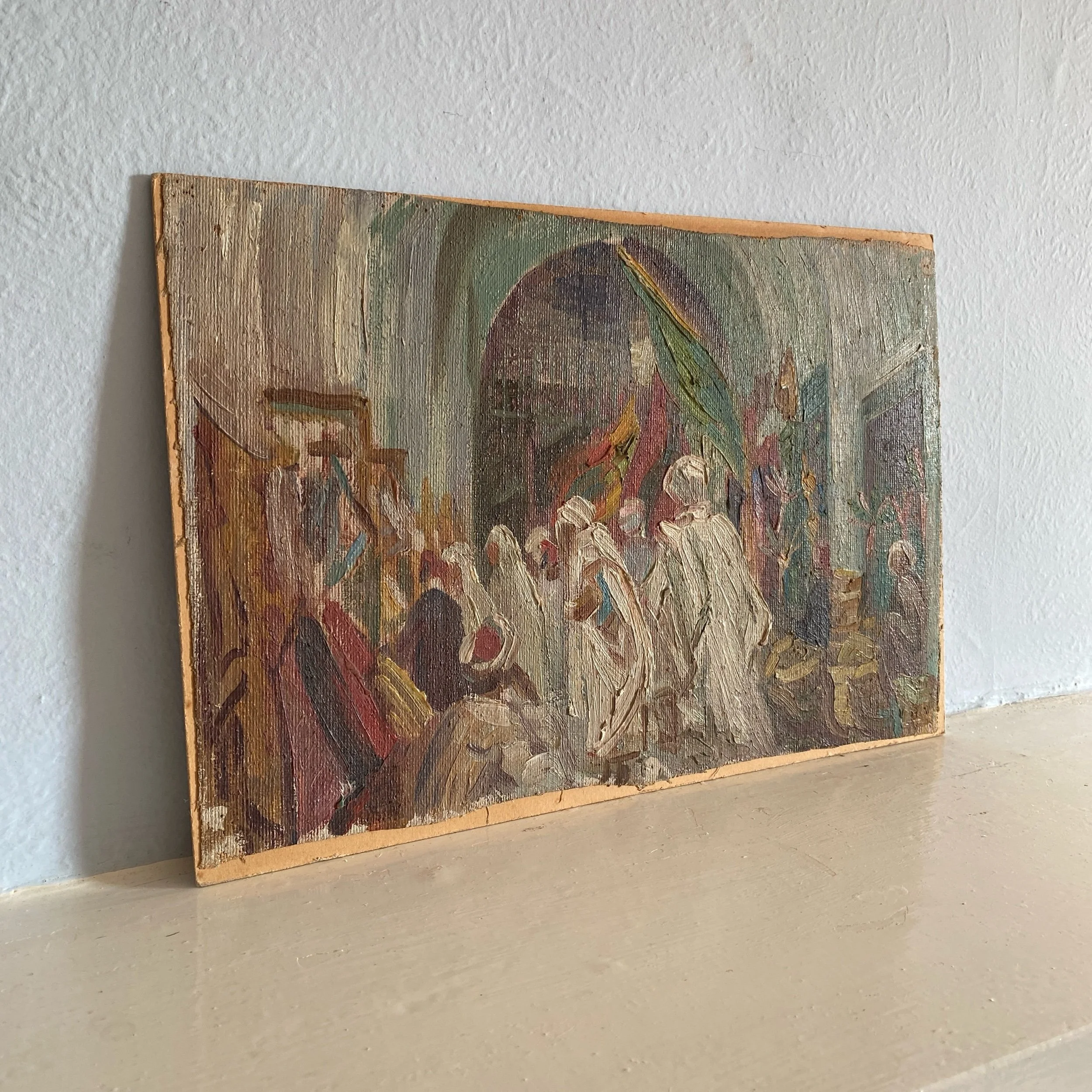 Turn of the 20th century North African market scene. Gestural oil of a bustling market. The gestural strokes of the paint brush gives movement to the scene as you could imagine the artist sitting watching the world move around them. Likely done by a European painter visiting a north African medina. Oil on canvas unframed, mounted on board. Overall measurements of 37cm x 25cm.